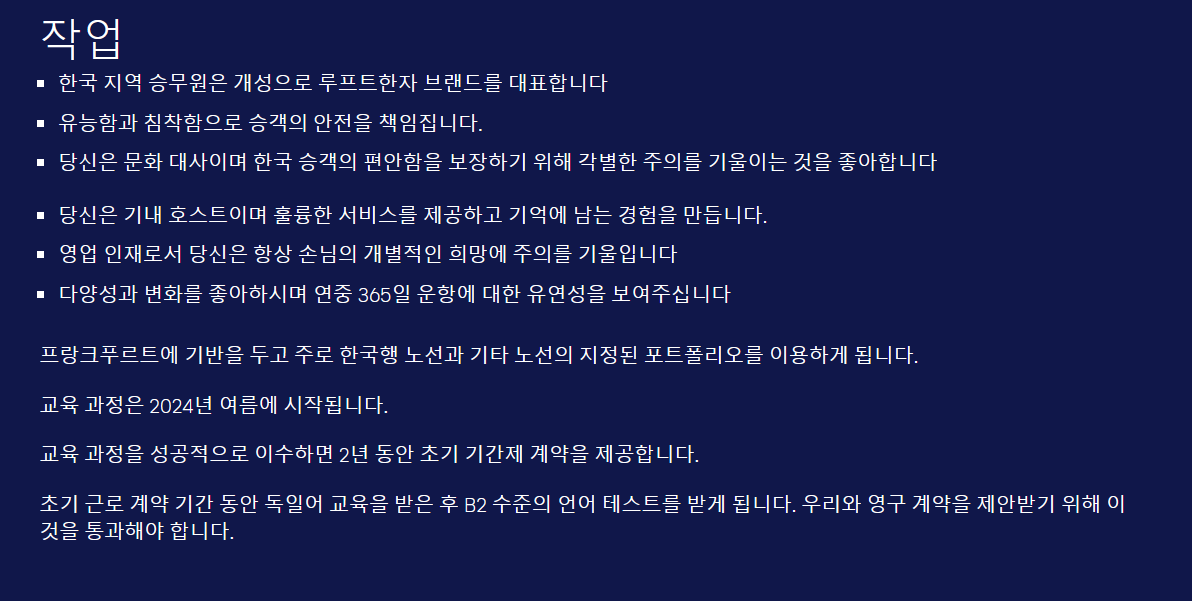 독일 루프트한자의 2024년 한국인 신입 객실 승무원 채용공고가 시작되었습니다. 외항사를 준비하는 분들에게 정말 기쁜 소식인데요! 고품격이미지와 서비스로 유명한 루프트한자에서 여러분의 꿈의 날개를 펼치시기를 바랍니다.