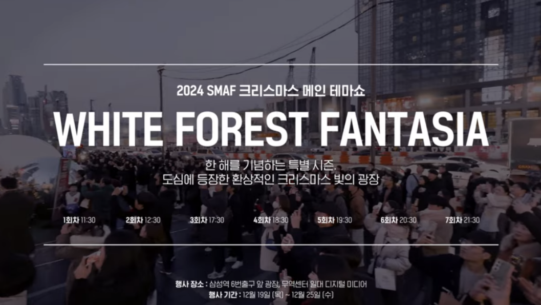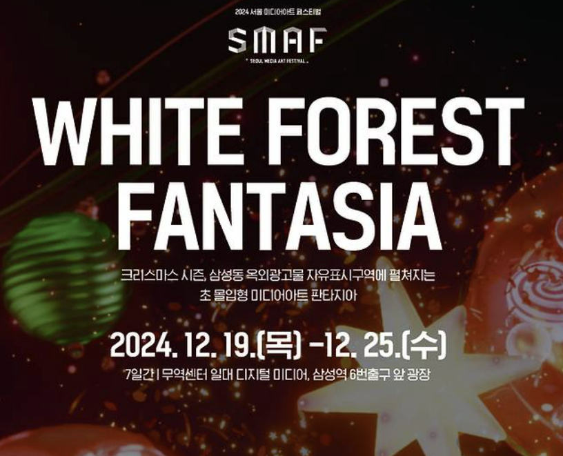 2024 연말/크리스마스 시즌에 사랑하는 사람들과 즐기기 좋은 서울 미디어아트 페스티벌(SMAF)에 대해 소개합니다! 따듯함을 넘어서 황홀한 기분을 느끼고 싶은 분들은 모두 이 글에 주목해 주세요! 행사의 주제는 "White Forest Fantasia"로 환상적인 빛의 광장을 화려한 미디어아트로 표현해 시선을 사로잡을 예정입니다. 그럼, 서울 미디어아트 페스티벌에 대해 꼼꼼히 살펴보겠습니다!.. 모두! 행복하세요 ..!! ♥