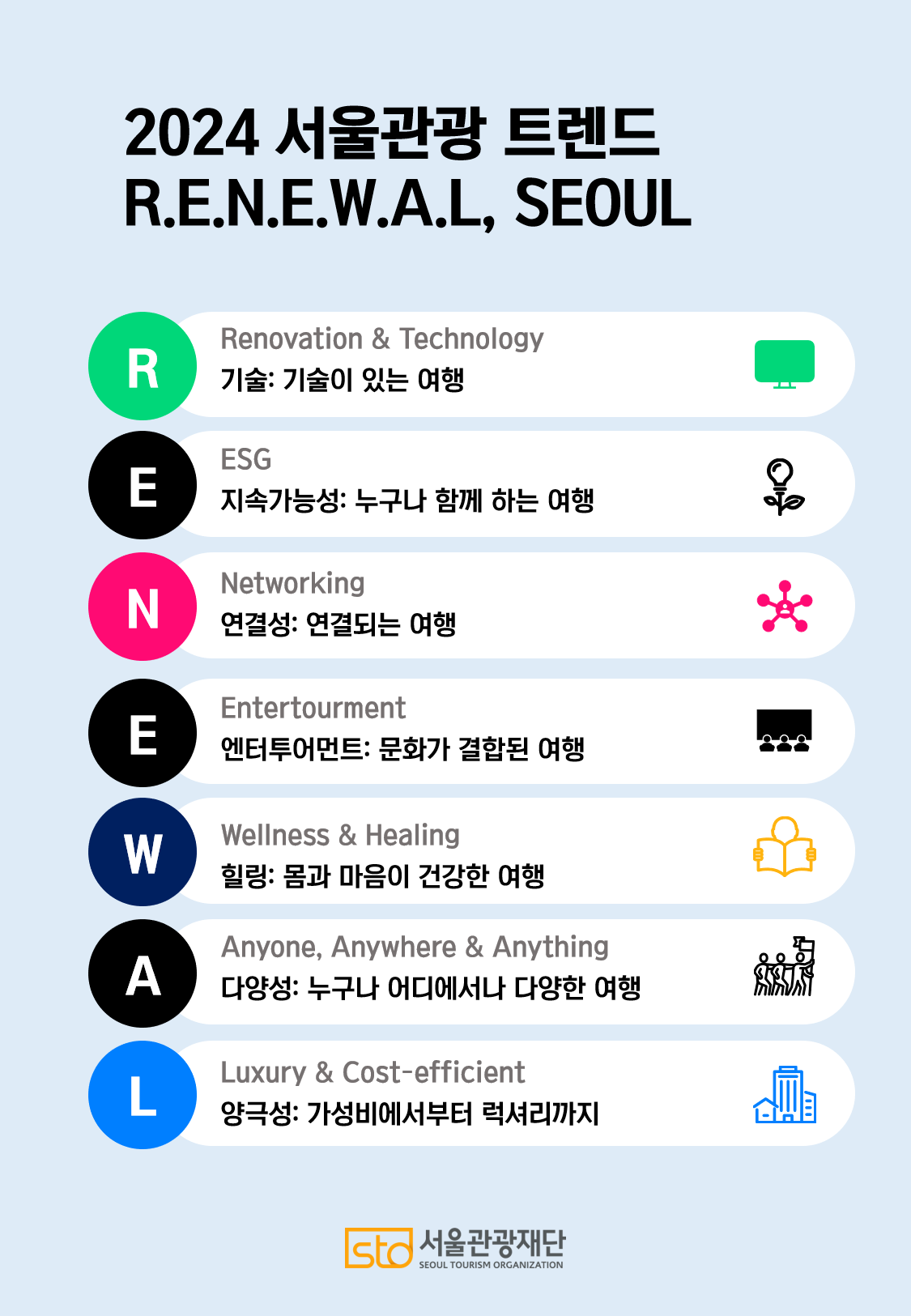 키워드를 자세하게 살펴보자면, R은 Renovation과 Technology를 뜻하는데요. 관광업계는 AI인공지능을 접목한 여행 일정 서비스를 제공하며 여행 계획부터 일정 추천 및 예약까지 여행의 모든 것에 최신 기술이 접목된다는 의미입니다. 이에 발맞춰 서울관광재단은 '비짓 서울'홈페이지에 챗봇 AI서비스를 제공하여 여행객들의 궁금 사항을 즉각적으로 해결해 줄 계획입니다. E는 친환경 사회 지배구조를 의미하는 ESG를 뜻합니다. 환경뿐만 아니라 모든 사람이 차별 없이 누릴 수 있는 여행을 만들고 싶다는 서울시의 목표입니다. N은 Networking 연결되는 여행을 의미하며 기술 발전에 따라 여행객들이 서로의 SNS 혹은 인터넷 포털사이트를 통해 상호연결, 공유 등을 활발히 하고 있는 것을 뜻하는데요. '초연결 시대'를 맞이한 여행객들은 적극적으로 SNS를 활용하여 정보를 얻고 경험을 공유하며 취향에 맞는 커뮤니티를 만들어 나가고 있습니다. 이는 시간이 흐를수록 더욱 강화가 될 예정입니다. E는 문화가 결합된 여행이라는 뜻의 Entertourment입니다. 좋아하는 가수의 공연과 콘서트가 가장 큰 목적이며 한국을 방문한 김에 주변 여행지를 함께 구경하게 됩니다. 이에 따라 콘서트와 뮤지컬 같은 문화 공연에 국내 숙소를 연계하여 K-컬처를 중심으로 한 패키지가 생성되고 있으며 2024년에는 규모가 더욱 확대될 것으로 전망됩니다. W는 Wellness&Healing을 의미하는 몸과 마음이 건강한 여행이라는 뜻입니다. 빠르게 변화되는 사회 환경 속에서 개인의 심리적, 신체적 안녕을 충족시키기 위해 여행을 떠나는 여행객이 증가되고 있습니다. A는 Anyone, Anywhere&Anything을 의미합니다. 누구나 어디에서 다양한 여행을 즐길 수 있으며 서울 전역에 다양한 인프라를 통해 서울 시민과 외국인 관광객들이 즐길 수 있는 콘텐츠를 선보일 예정입니다. L은 Luxury&Cost-efficient로 가성비에서 럭셔리 까지라는 의미인데요. 고물가 시대 저비용, 고효율의 가성비를 추구하는 여행 형태가 증가하고 있는 반면에, 이와 동시에 차별화된 경험을 위해서라면 고가의 여행 지출도 마다하지 않는 여행객들도 증가하고 있습니다.
