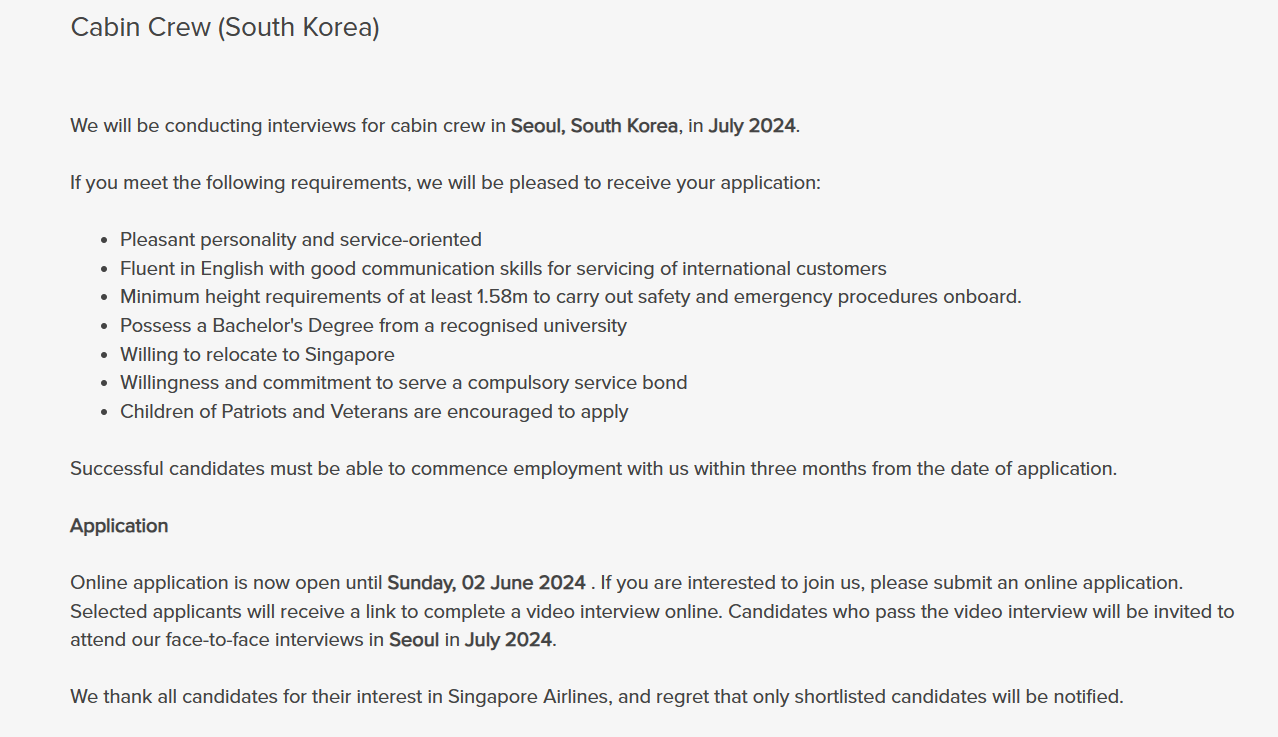 싱가포르항공, 2024년 한국인 객실 승무원 채용 공고