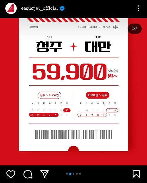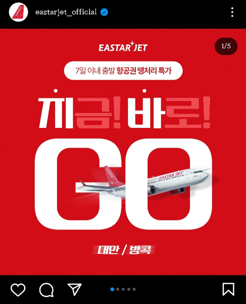 이스타항공에서 매주 불시에 갑자기 찾아오는 특가이벤트를 선보이고 있습니다! 7일 이내 출발 항공권을 땡처리 특가로 판매하는 것인데요. 이는 이스타항공의 인스타그램을 팔로우한 후 스토리와 피드를 통해 매주 불시에 공개합니다! 이번주는 청주-대만 노선, 제주-대만 노선, 인천-방콕 노선을 현재 특가로 공개했는데요. 급하게 여행 계획이 있으신 분은 이스타항공의 SNS을 적극적으로 활용해 봐도 좋을 것 같습니다! :)