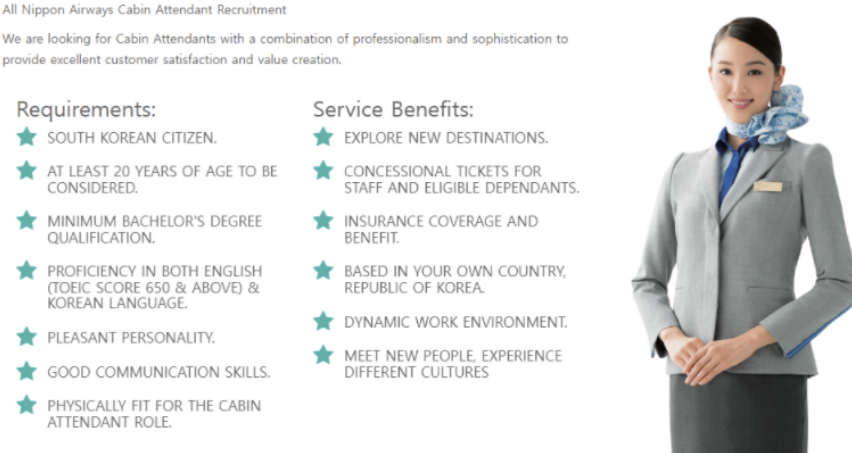 일본 ANA항공에서 한국인 객실 승무원 채용이 진행 중에 있습니다 :) 한국 베이스라는 것이 참 매력적인데요! 향수병으로 어려움을 겪었던 전직 승무원이나 외항사는 희망하지만 멀리 가는 것은 꺼려했던 승무원 준비생 분들에게 참 좋은 기회라고 생각합니다! 일본어는 못해도 되지만, 영어는 필수입니다!