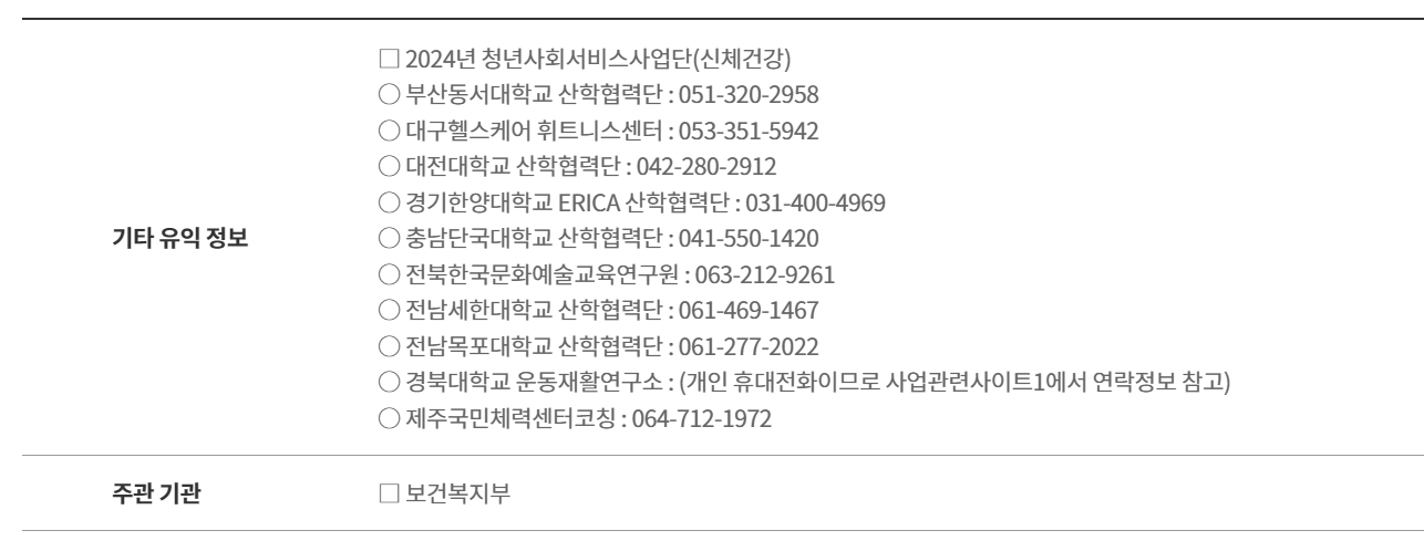 청년 신체건강증진서비스는 보건복지부에서 청년이 지역사회서비스 제공에 참여하도록 지원해 청년에게 사회참여 및 역량 강화의 기회를 제공하고자 하는 것이 목적입니다. 또한, 사회서비스를 통해 지역주민의 삶의 질을 높이기 위해 운영하고 있습니다. 지원자격에 해당이 되는 분들은 꼭 정부지원 사업에 혜택을 받으셔서 건강한 신체를 만드시기를 바랍니다 :)