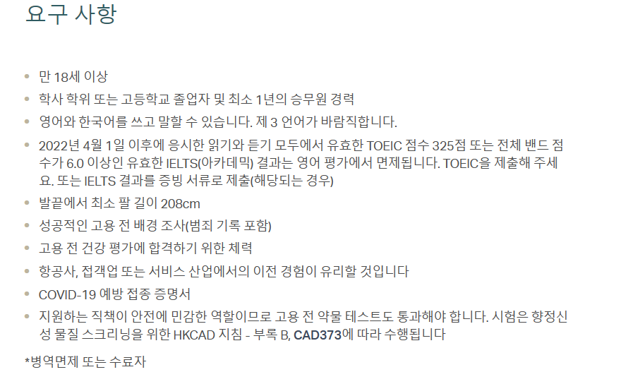 캐세이퍼시픽 승무원 자격 요건은 작년과 동일합니다.