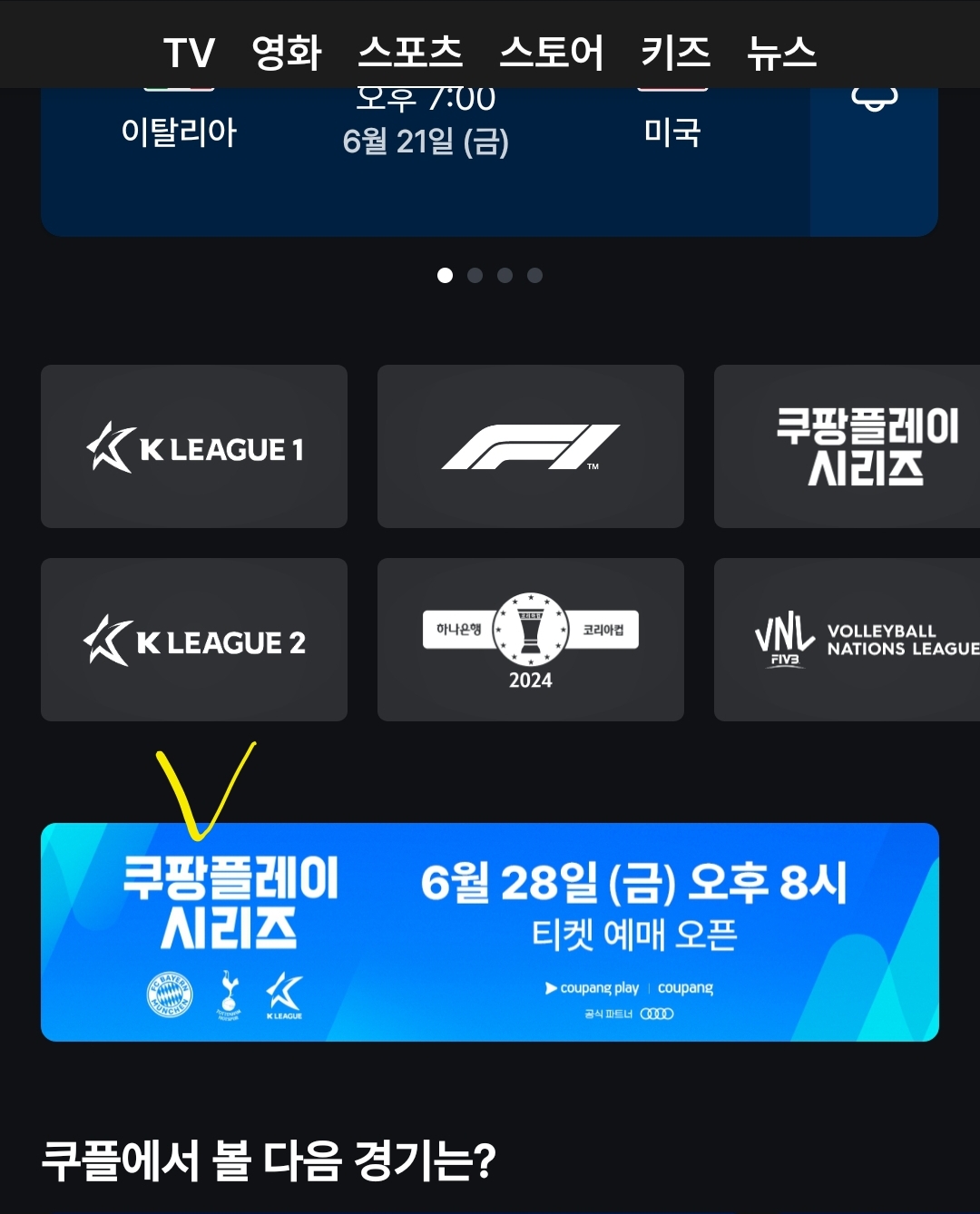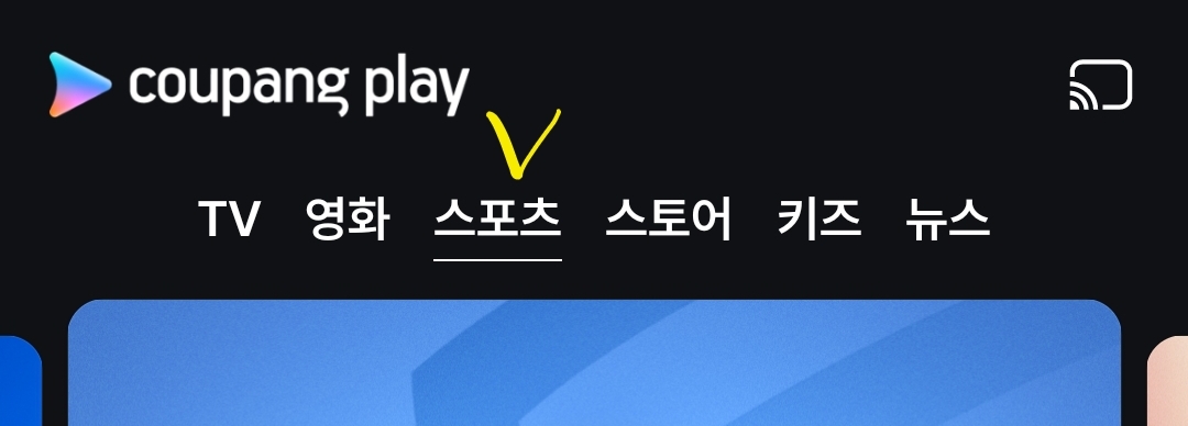 2. 쿠팡플레이 로그인 및 회원가입 후 홈화면 상단 가운데에 '스포츠'란이 있습니다. 클릭해주세요