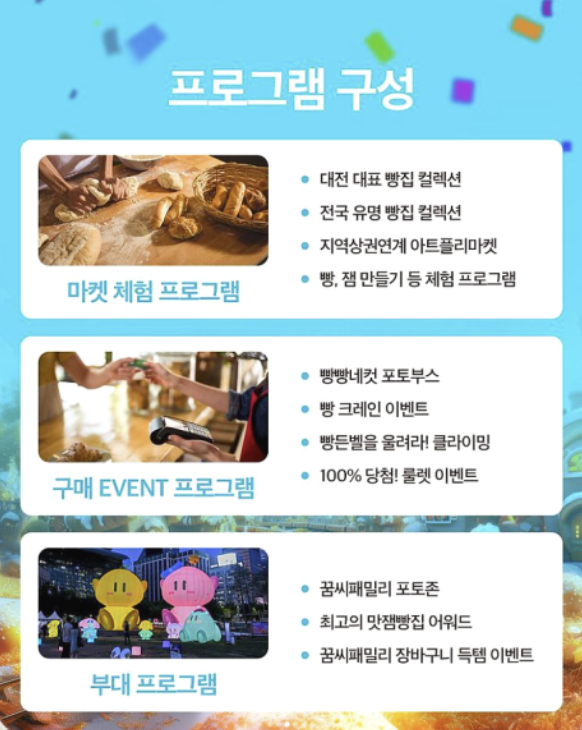 - 부대행사: 꿈씨패밀리 포토존, 빵골든벨, 최고의 맛잼빵집 어워즈