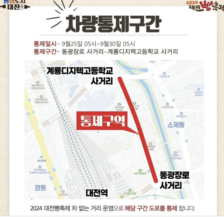 2024년 대전 빵 축제는 차 없는 거리로 운영됩니다. 위의 사진 내용과 같이 계룡디지텍고등학교 사거리~동광장로 사거리까지 통제될 예정이므로 참고 부탁드립니다!