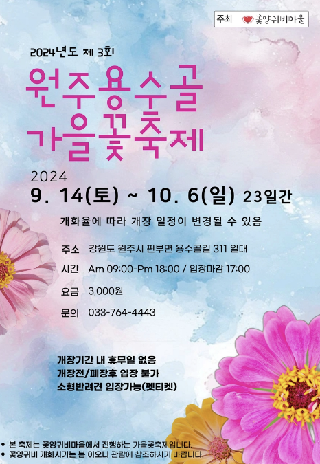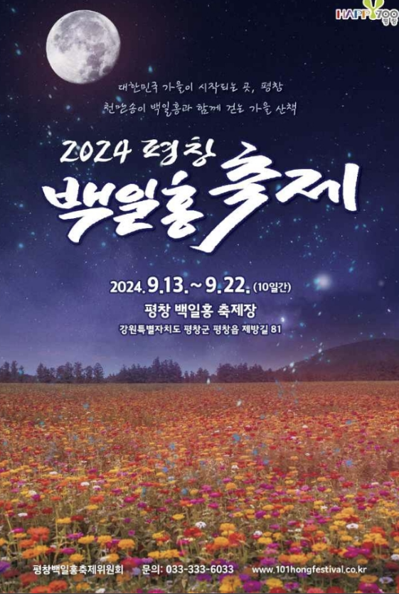- 장소: 강원특별자치도 평창군 평창읍 제방길 81 평창백일홍축제장